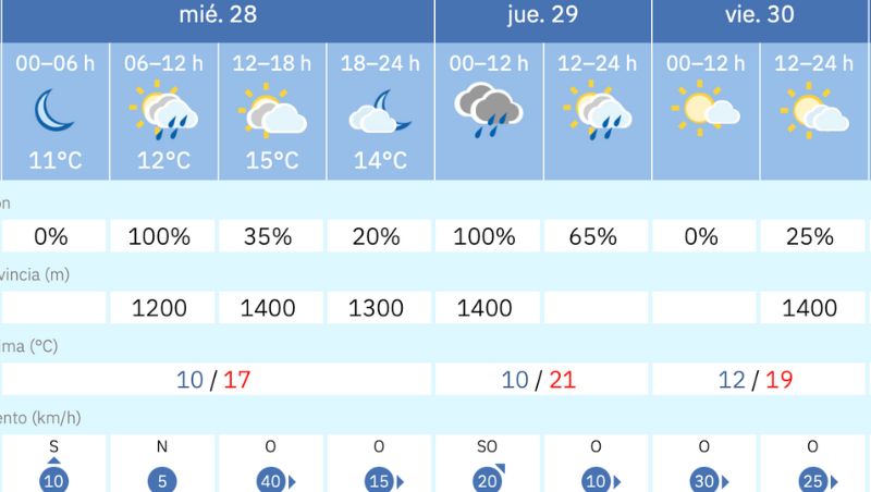 - Jueves 29 de enero La mañana estará marcada por lluvias persistentes (100% de probabilidad) y viento del suroeste. Por la tarde, se esperan intervalos de lluvia con claros (65% de probabilidad). Las temperaturas subirán hasta los 21°C, y la cota de nieve se mantendrá en los 1400 metros.