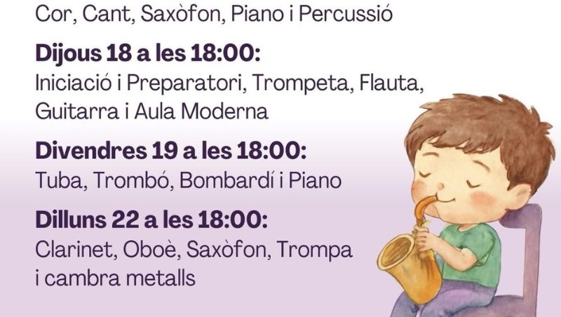 - Jueves 18 a las 18:00: Iniciación y Preparatorio, Trompeta, Flauta, Guitarra y Aula Moderna