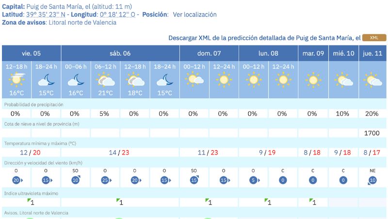 La Agencia Estatal de Meteorología (AEMET) prevé un puente de diciembre marcado por temperaturas suaves y cielos despejados en El Puig de Santa Maria. Una previsión que permitirá disfrutar plenamente de los actos organizados por las Purísimas en sus días grandes, con música, tradición y devoción como protagonistas.