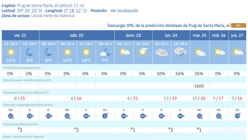 La Agencia Estatal de Meteorología (AEMET) anuncia un fin de semana marcado por la estabilidad atmosférica en El Puig de Santa Maria. El sol será protagonista durante los próximos días, aunque acompañado de un descenso de las temperaturas que ya se ha empezado a notar desde hoy viernes.