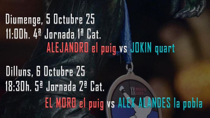 La segunda partida tendrá lugar el lunes 6 de octubre a las 18:30 horas, correspondiente a la 5ª jornada de segunda categoría. En esta ocasión, El Moro, también del Club de El Puig, se medirá contra Álex Alandés, del Club de la Pobla. Una partida que se espera igualada y vibrante, con dos jugadores que destacan por su entrega y estilo de juego.