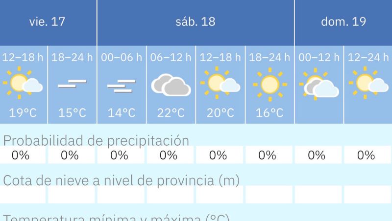 El sábado amanecerá con cielos nubosos, aunque la evolución será positiva: a partir del mediodía se abrirán claros que dejarán una tarde muy agradable. Las temperaturas se moverán entre los 13 °C y los 23 °C, con un pico de 22 °C a media mañana y un descenso suave hacia los 16 °C por la noche. El viento será flojo, alternando direcciones entre este, noreste y oeste, sin generar molestias.