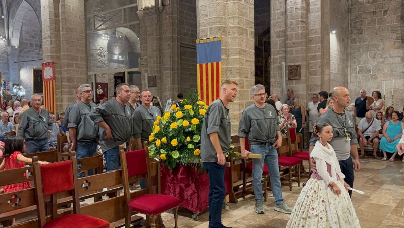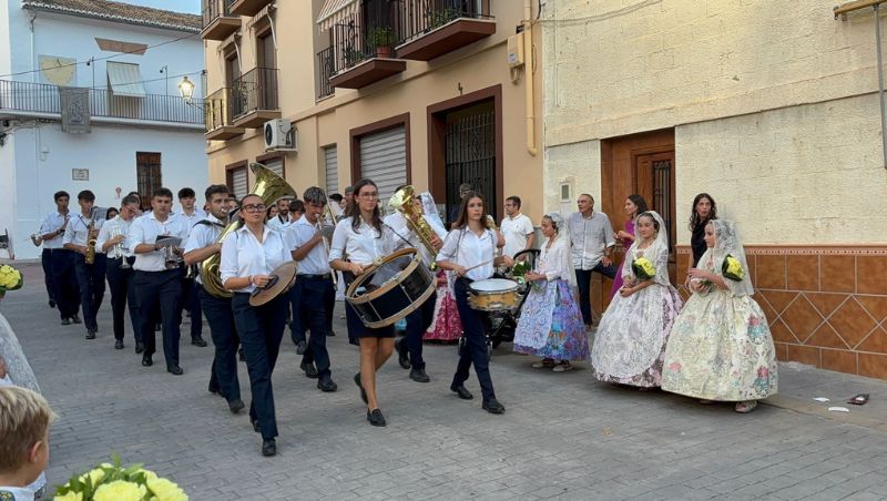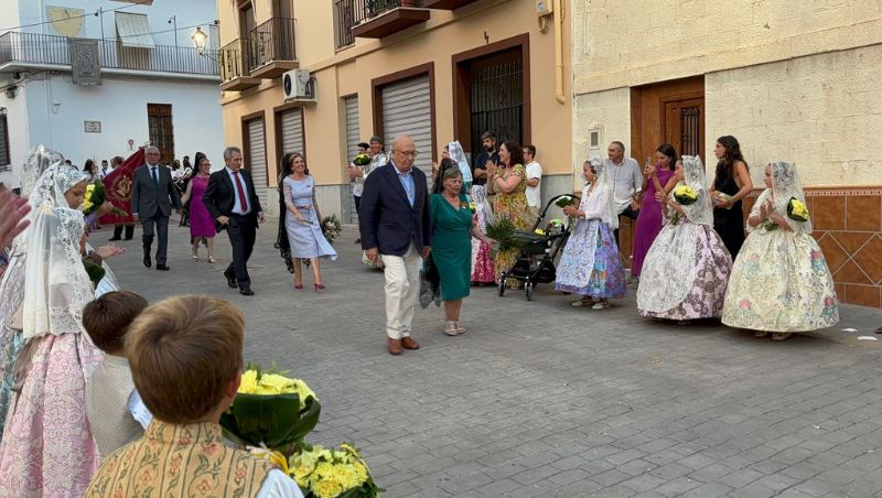 Sobre las 20:00 horas, el sonido tradicional anunciaba la llegada del desfile a la Plaza del Ayuntamiento. Las Camareras y Clavarios hicieron su entrada entre aplausos de numerosos vecinos, mientras la Corporación Municipal les esperaba a las puertas del consistorio. Juntos, iniciaron el recorrido hacia la Iglesia del Real Monasterio de Santa Maria de El Puig, donde tuvo lugar la esperada Ofrenda de Flores.