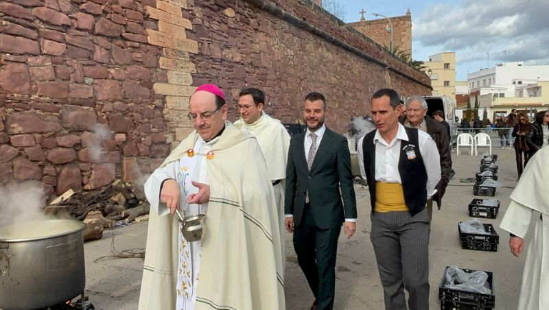 El arzobispo, junto al alcalde Marc Oriola y Vicente Flores, bendijo una a una las calderas antes de que cientos de vecinos recogieran su ración en la Plaça del Cant Valencià, que ya estaba completamente llena.