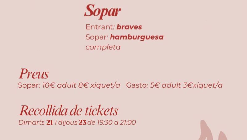Los tickets se podrán recoger en el Casal los días martes 21 y jueves 23 de octubre, en horario de 19:30 h a 21:00 h. En caso de no poder acudir, la organización anima a contactar con cualquier miembro de la junta para facilitar la reserva.