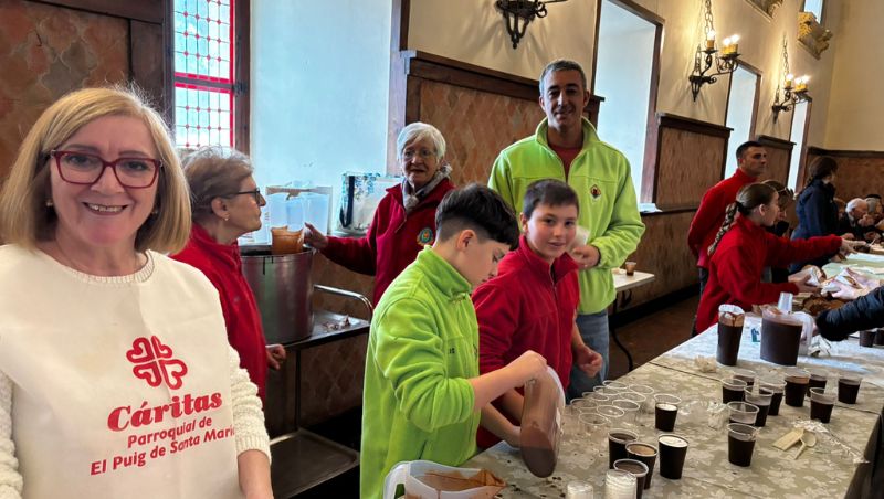 El desayuno, compuesto por chocolate caliente y coca por un donativo de 3 euros, ha sido preparado con dedicación por Cáritas El Puig y por las tres Fallas del municipio, que desde primera hora de la mañana han trabajado codo con codo para que todo estuviera listo. El aroma del chocolate, las conversaciones animadas y la ilusión de los más pequeños han convertido la actividad en un punto de encuentro para familias, jóvenes y mayores.