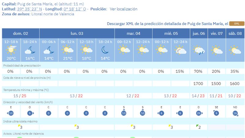 La Agencia Estatal de Meteorología (AEMET) prevé un arranque de semana estable y mayormente soleado en El Puig de Santa Maria, con temperaturas suaves y escasas precipitaciones entre el lunes 27 y el jueves 30 de octubre.