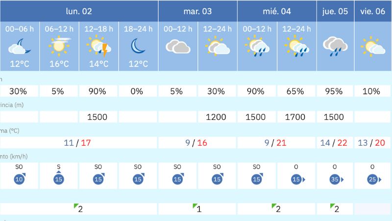 La semana comenzará con cielos nubosos durante la madrugada y primeras horas del día, aunque el sol hará acto de presencia por la mañana. A mediodía se prevén tormentas puntuales con una probabilidad de precipitación que alcanza el 90 %. La tarde dará paso a una noche despejada. Las temperaturas se moverán entre los 11 °C y los 17 °C, con viento del sur y suroeste entre 10 y 15 km/h.