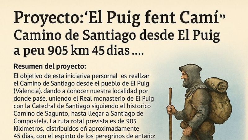 El vecino de El Puig Ramon Salvador Gausi, conocido popularmente como Carliste y residente en la placeta Sant Roc, ha anunciado un reto personal y simbólico que quiere llevar a cabo próximamente: caminar desde El Puig hasta Santiago de Compostela, un recorrido de aproximadamente 905 kilómetros que espera completar en 45 días bajo el lema “El Puig fent camí”.