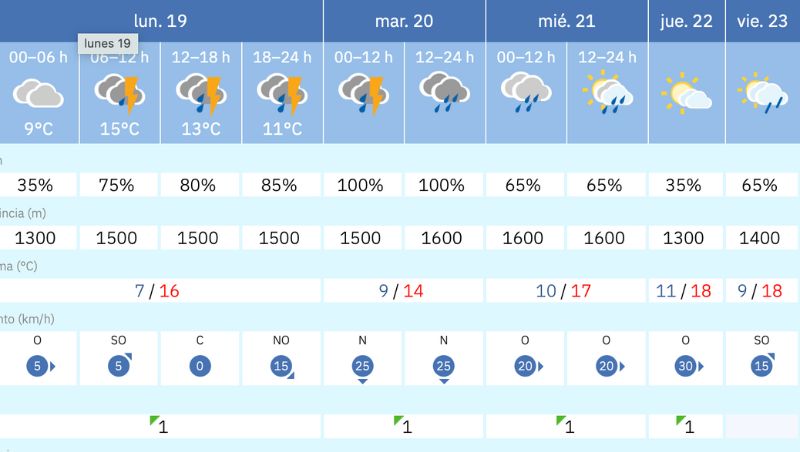 La semana comenzará con cielos muy nubosos y precipitaciones intermitentes desde la madrugada. La probabilidad de lluvia aumentará conforme avance la jornada, alcanzando valores elevados por la noche. Las temperaturas oscilarán entre los 7 °C y los 16 °C, con visibilidad reducida y viento variable, destacando rachas del noroeste de hasta 15 km/h al final del día.