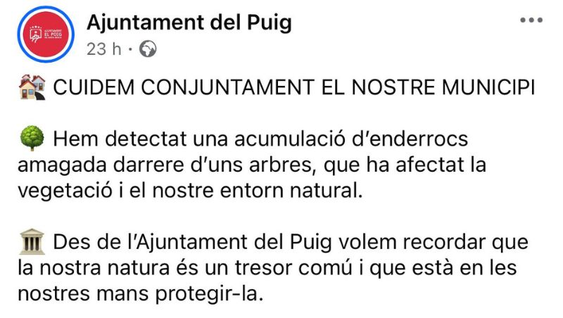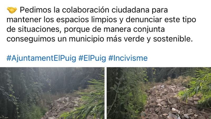 Este fenómeno no es nuevo. Desde hace años, vecinos y colectivos han denunciado la existencia de estos focos de suciedad, pero la falta de soluciones efectivas ha permitido que el problema se extienda. Recientemente, el Ayuntamiento de El Puig ha compartido en sus redes sociales una nueva denuncia: “Hemos detectado una acumulación de escombros escondida detrás de unos árboles, que ha afectado a la vegetación y a nuestro entorno natural. Desde el Ayuntamiento de El Puig queremos recordar que nuestra naturaleza es un tesoro común y que está en nuestras manos protegerla.”